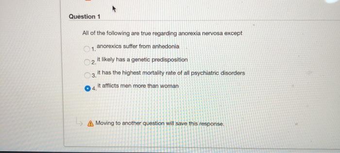 All of the following statements about anorexia nervosa are trueEXCEPT ________. PSY-470 Abnormal Psychology Grand Canyon University. Each of the following is a symptom of anorexia nervosa except ________.