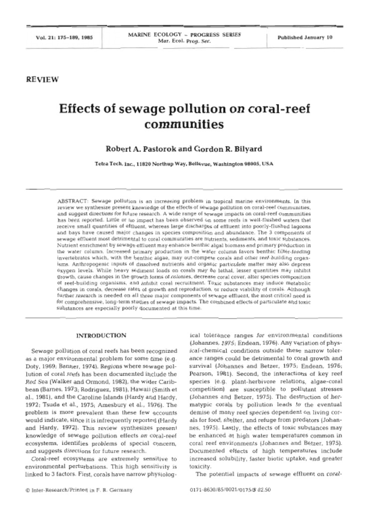 In this revlew we synthesize present knowledge of the effects of sewage pollution on coral-reef communities and suggest directions for future research. Each quantitative reef survey consisted of a number of line transects. 115 144 146 For example a study examining two bays in Thailand one sewage impacted and the other not found that the sewageimpacted bay had.