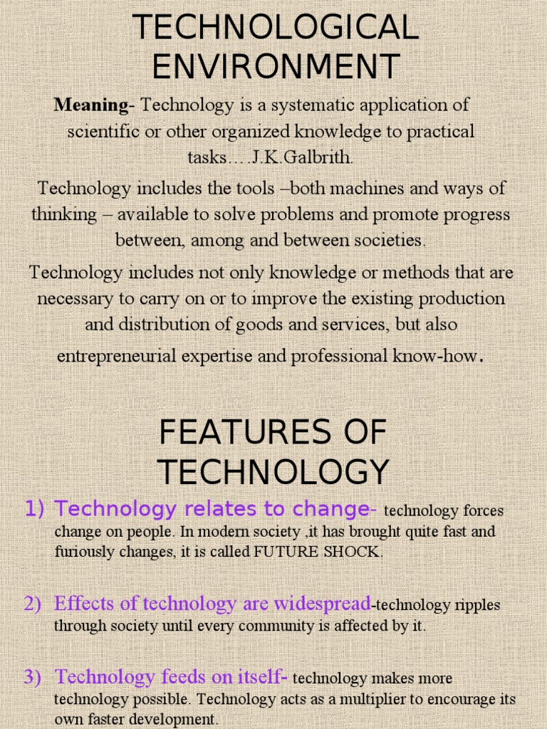 Now all work is done online and business shops are using. Definition of Technological Environment -Technological Environment means the development in the field of technology which affects business by new inventions of productions and other improvements in techniques to perform the business work. Technological Change and the Environment 463 1.