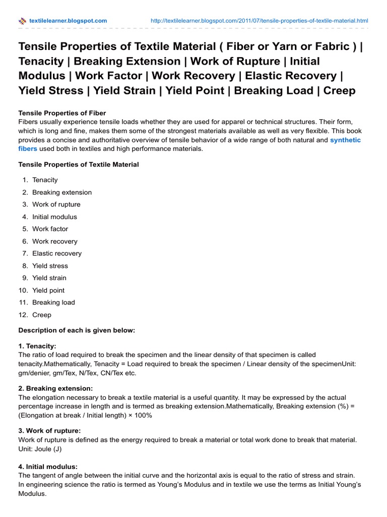 The strength of any material is derived from the load it supports at the break and is thus a measure of its limiting load-bearing capacity. The moisture relationships of the various fibers type differ. Flexural Properties Tensile properties of textile fibers Tensile properties indicates how a material fiber will react to the forces being applied in.